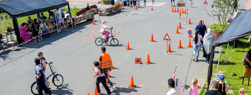 De aftrap was meteen feestelijk: wethouder Sidney van den Bergh opende samen met kinderen uit de buurt en de opvang ons splinternieuwe verkeersplein. Daar leerden de kids op een speelse manier de belangrijkste verkeersregels, begeleid door enthousiaste vrijwilligers van VVN. Ook het fietsbehendigheidsparcours was een grote hit: van slalommen tot fietsen met één hand – iedereen probeerde het uit. De kleinsten reden trots hun rondjes over het verkeersplein met hun loopfiets of step.